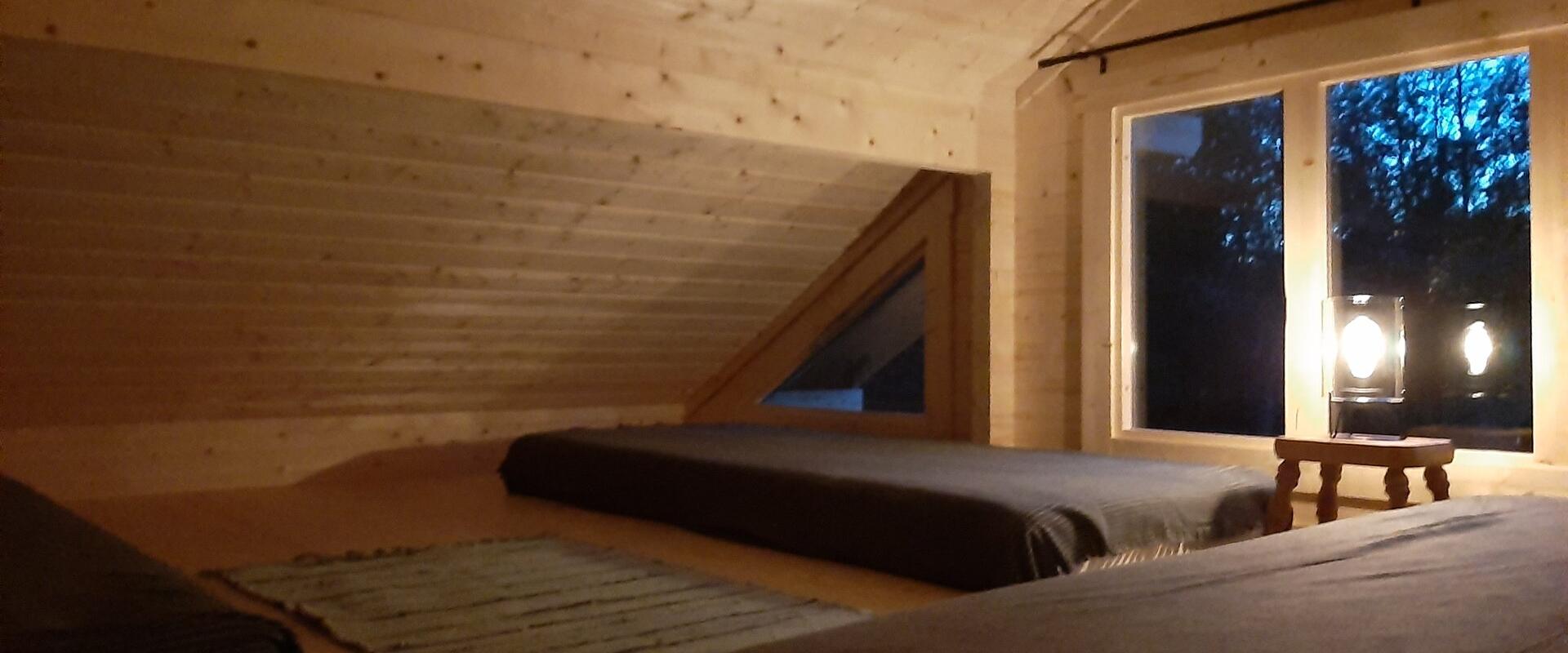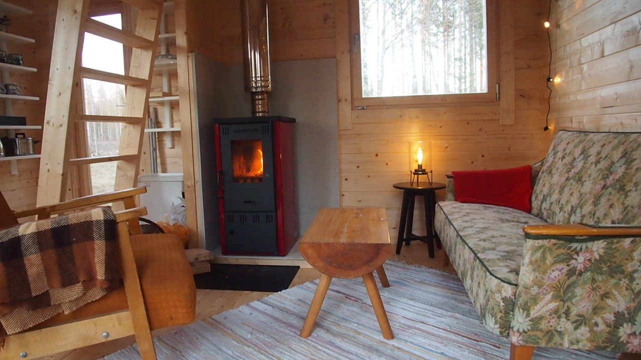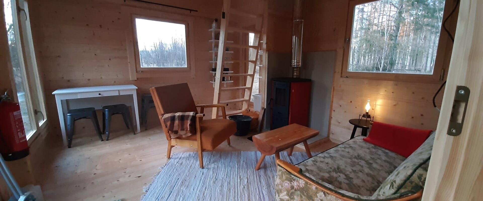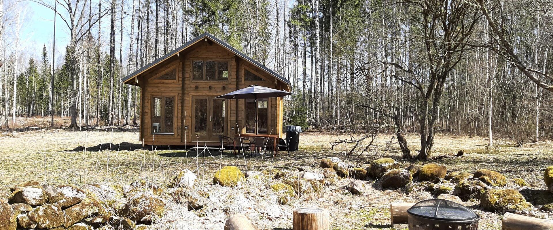 Stay at our rustic back-to-basics (no electricity or running water) Metsatare cabin in the woods. 1 double bed in bedroom downstairs, 3 single mattresses on floor of upstairs loft. Wood-burning stove/fireplace. Campfire pit with grill outside. Composting toilet outside. Some cooking equipment provided. You can always borrow what’s needed from the main farmhouse, or cook at the main house (if available). Closest restaurant just a 10 min drive away. Battery operated lights and drinking water provided. If your phone runs out of juice, it can be charged at one of our other buildings. Check in from 16.00, check out at 12.00.