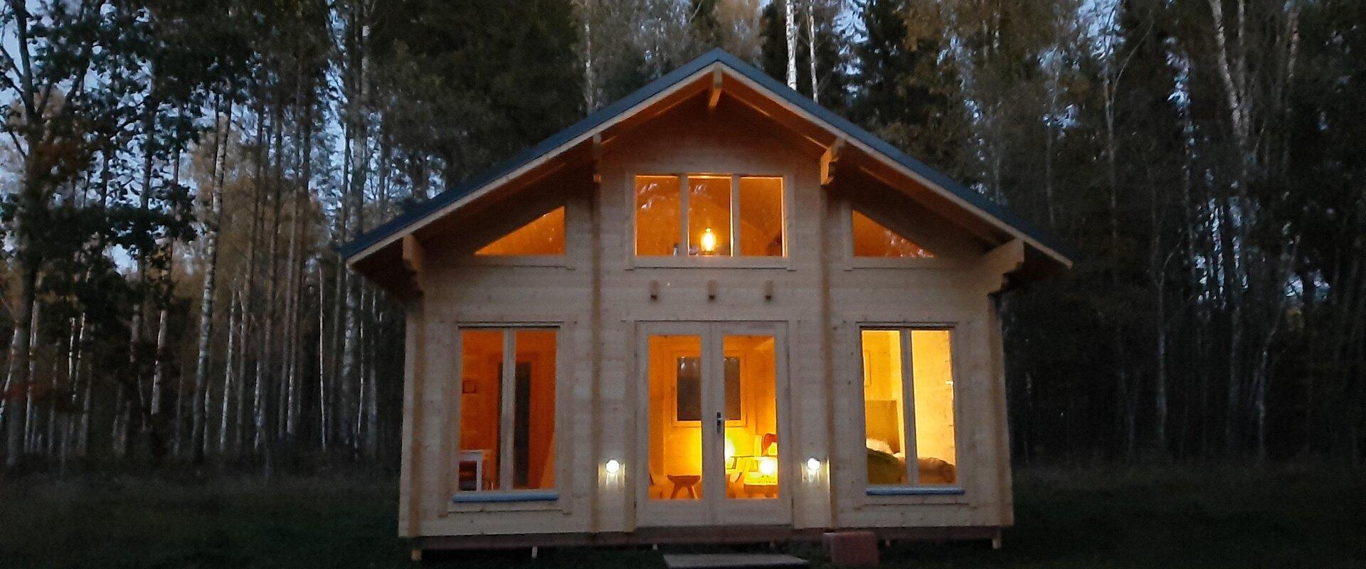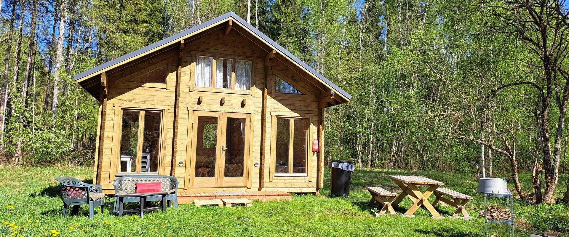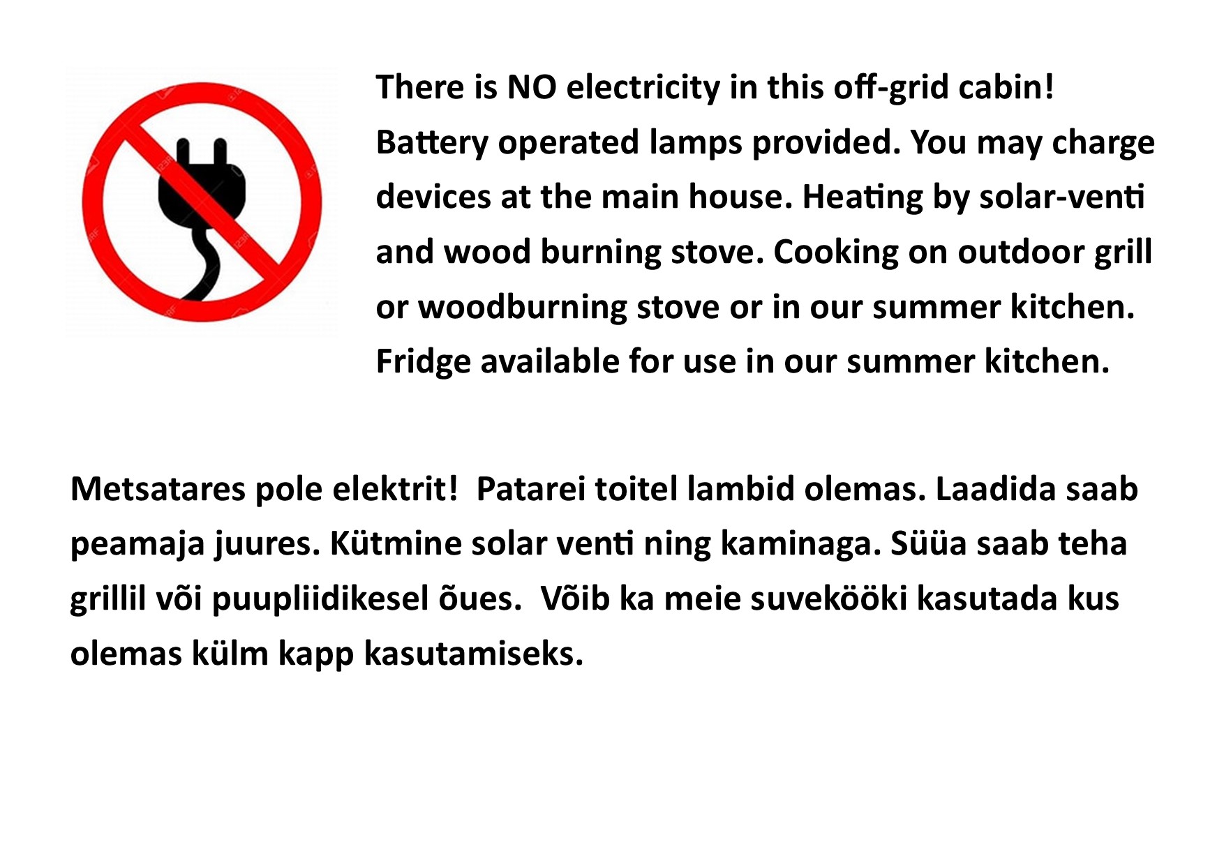 Stay at our rustic back-to-basics (no electricity or running water) Metsatare cabin in the woods. 1 double bed in bedroom downstairs, 3 single mattresses on floor of upstairs loft. Wood-burning stove/fireplace. Campfire pit with grill outside. Composting toilet outside. Some cooking equipment provided. You can always borrow what’s needed from the main farmhouse, or cook at the main house (if available). Closest restaurant just a 10 min drive away. Battery operated lights and drinking water provided. If your phone runs out of juice, it can be charged at one of our other buildings. Check in from 16.00, check out at 12.00.