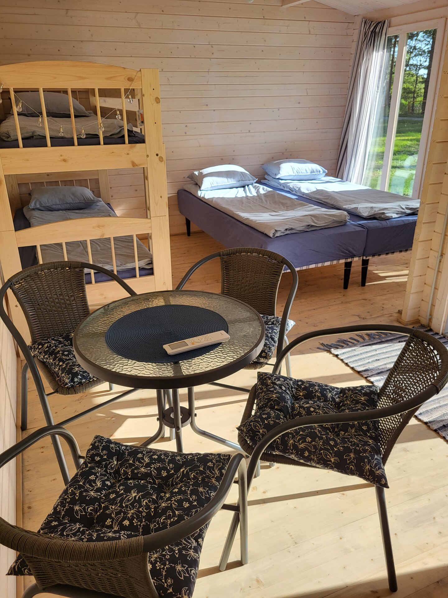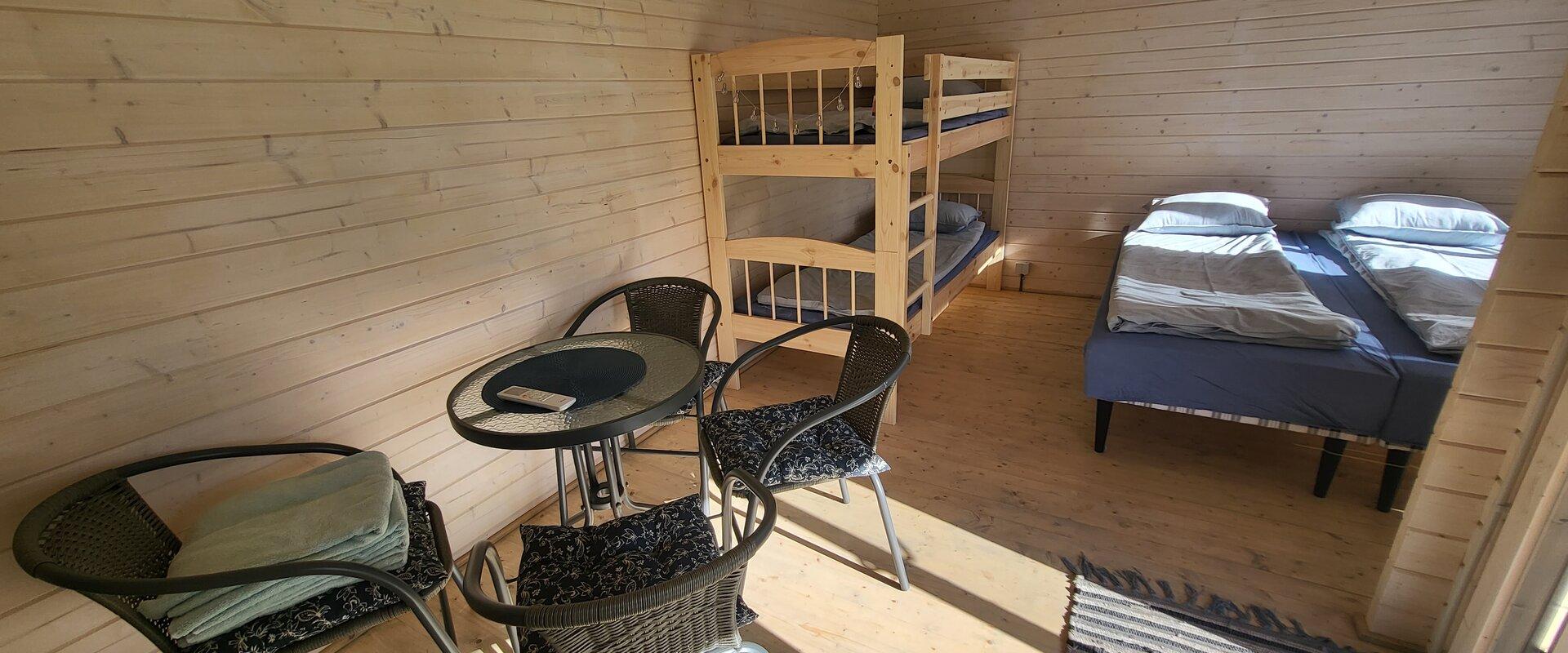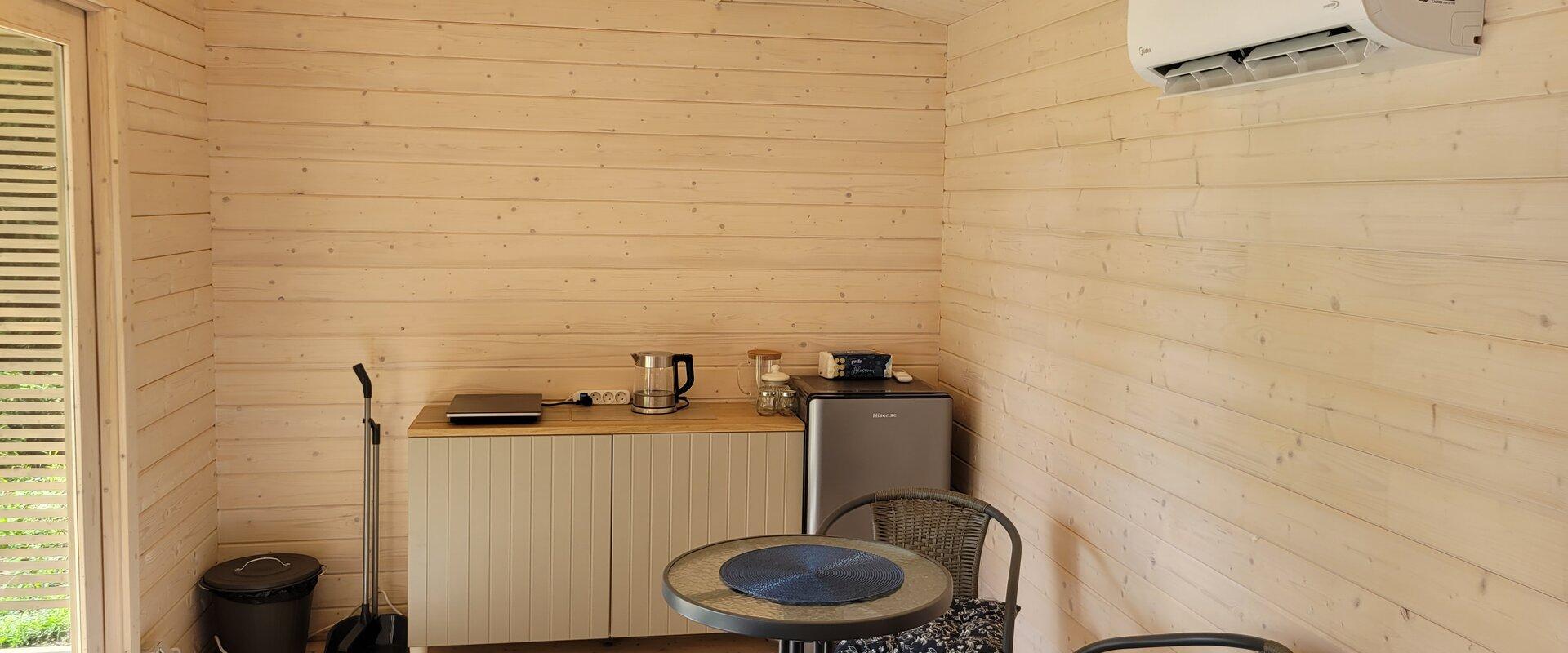 Majakesed on muidu identsed, väikese erinevusega selles, et ühes neist on neli kohta (nari + 2 voodit) ja teises 3 (eraldi voodid). Majakestes on kööginurk, kus olemas kõik mõnusaks toiduvalmistamiseks, õhksoojuspump, mis kuumaga jahutab, külmaga kütab. Vett ja kanalisatsiooni majas pole, wc ja dušš asuvad suures majas u 100m kaugusel.