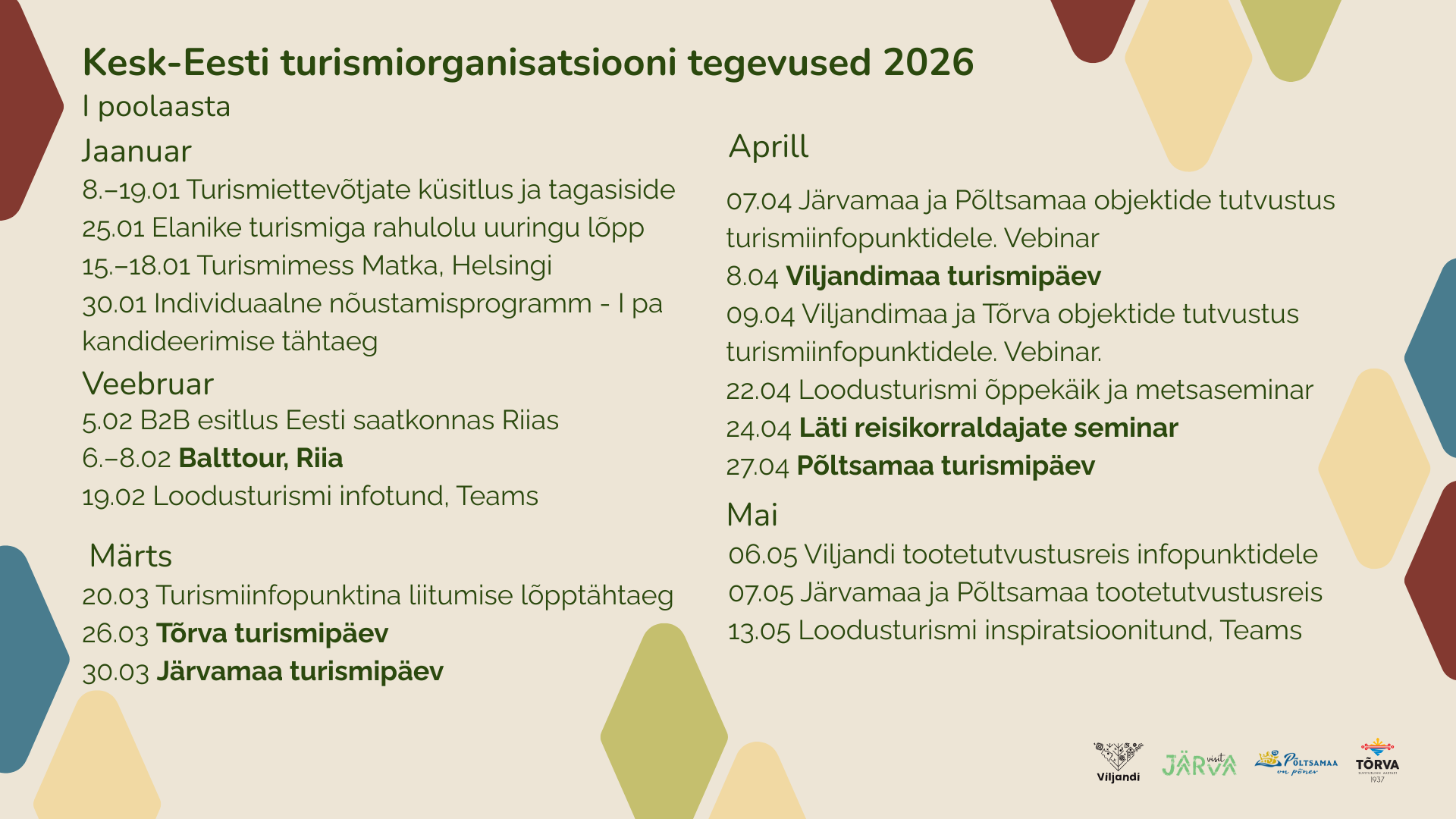 Traditsioonilisel kevadisel kohtumisel võetakse kokku eelnenud aasta tegevused ja tutvustatakse uusi plaane. Osalema on oodatud kõik Viljandimaal tegutsevad turismiettevõtjad.